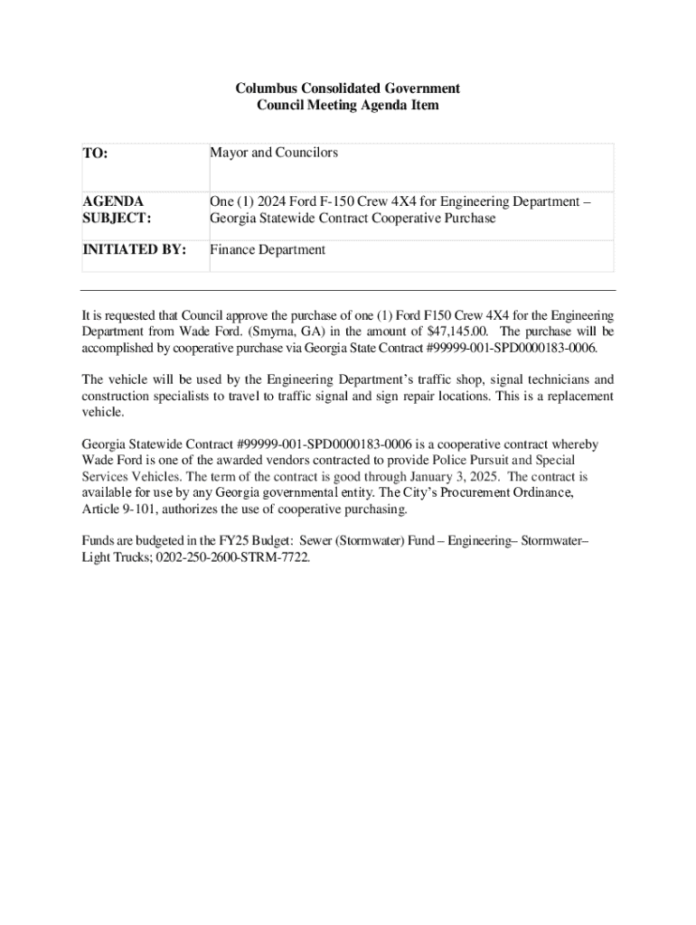 Get the free Mayor and Councilors AGENDA SUBJECT: One (1) 2023 Ford ...