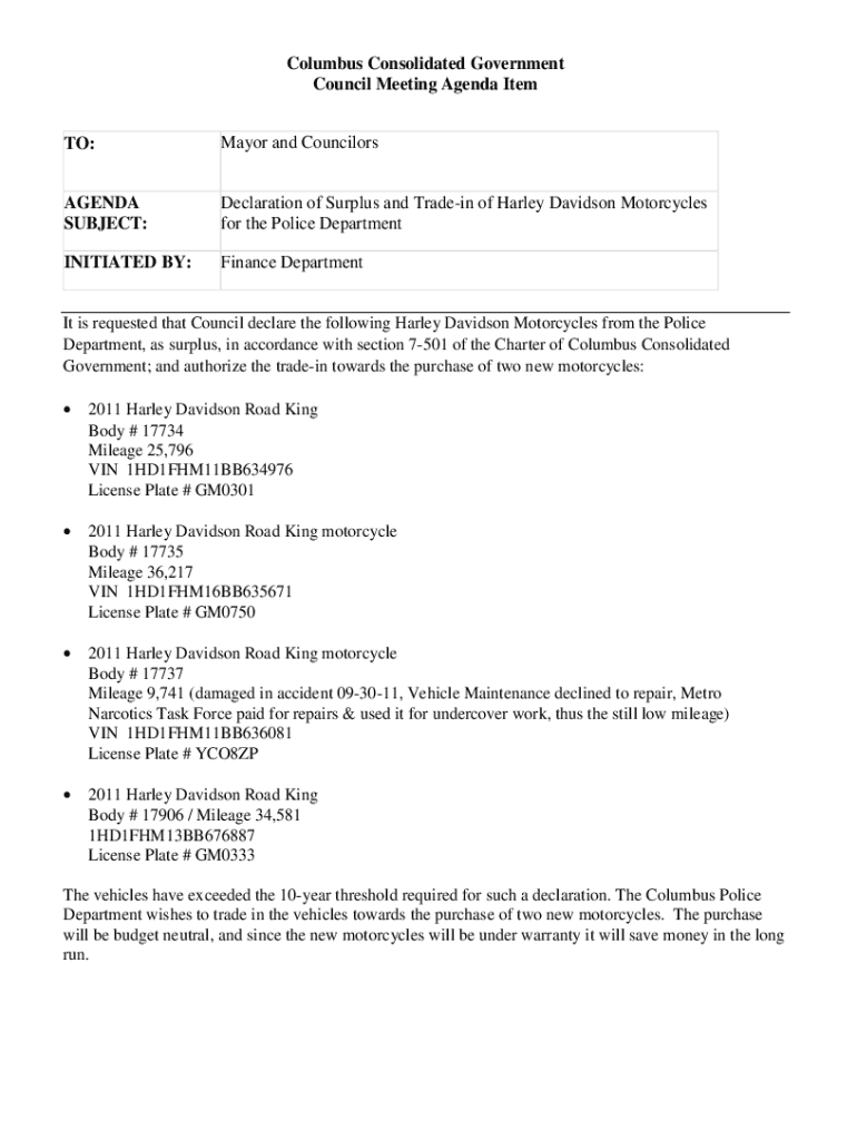 Columbus Consolidated Government Council Meeting Agenda Item TO:Mayor and CouncilorsAGENDA SUBJECT:Declaration of Surplus and Tradein of Harley Davidson Motorcycles for the Police DepartmentINITIATED