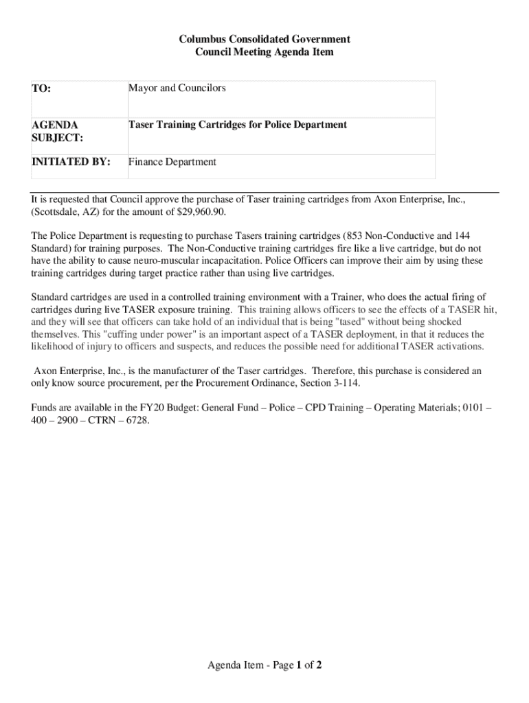 Get the free It is requested that Council approve the purchase of Taser training cartridges from ...