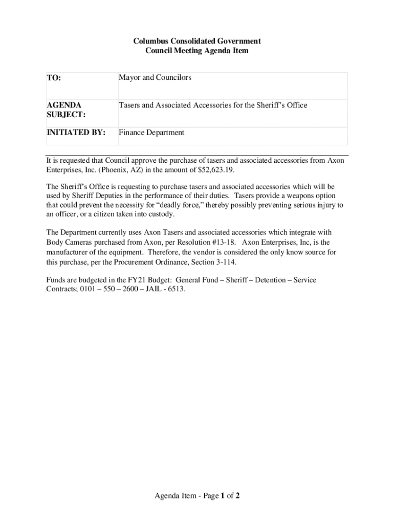 Columbus Consolidated Government Council Meeting Agenda Item TO:Mayor and CouncilorsAGENDA SUBJECT:Tasers and Associated Accessories for the Sheriffs OfficeINITIATED BY:Finance DepartmentIt is requested