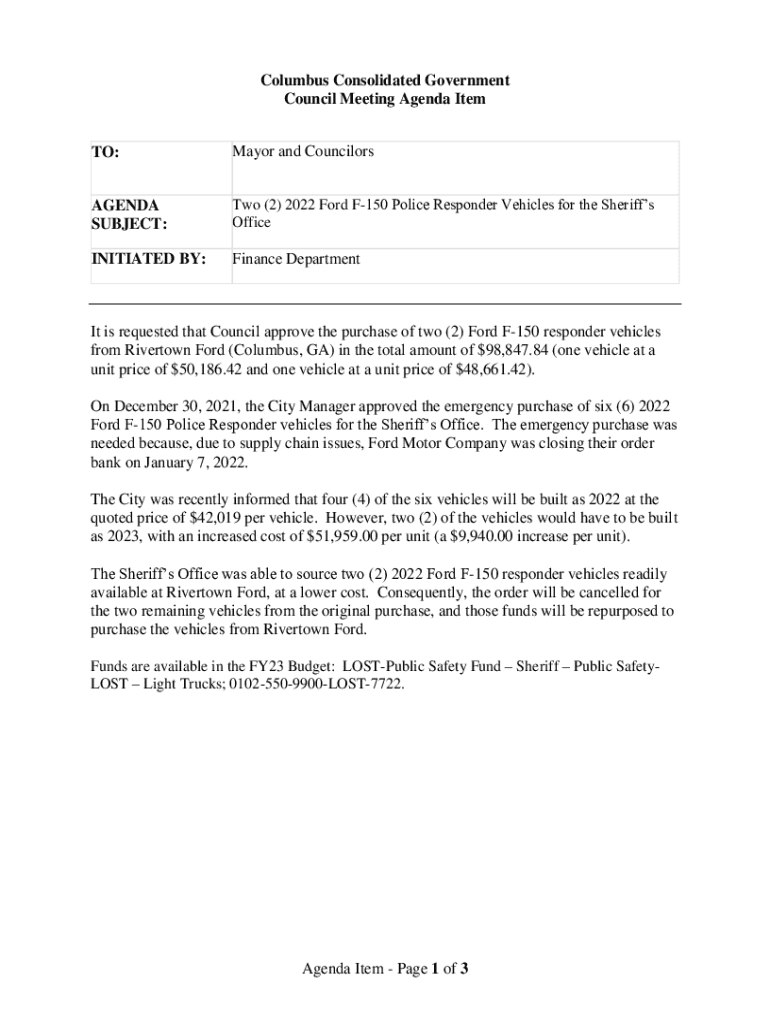 Get the free Two (2) 2022 Ford F-150 Police Responder Vehicles for the Sheriffs