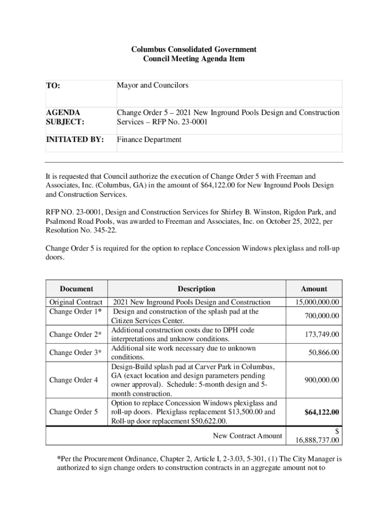 Get the free Mayor and Councilors AGENDA SUBJECT: Change Order 4