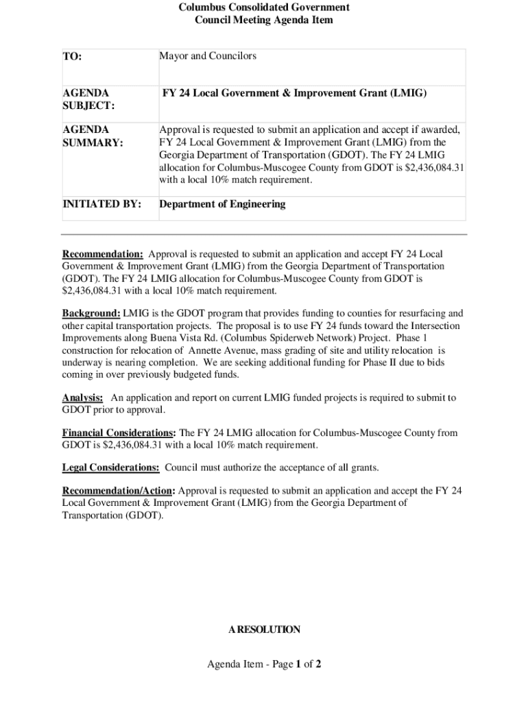 Columbus Consolidated Government Council Meeting Agenda Item TO:Mayor and CouncilorsAGENDA SUBJECT:FY 24 Local Government & Improvement Grant (LMIG)AGENDA SUMMARY:Approval is requested to submit an
