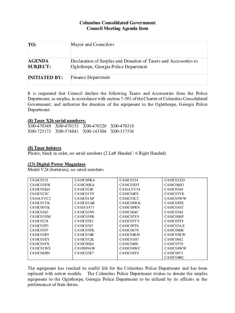 Columbus Consolidated Government Council Meeting Agenda Item TO:Mayor and CouncilorsAGENDA SUBJECT:Declaration of Surplus and Donation of Tasers and Accessories to Oglethorpe, Georgia Police DepartmentINITIATED