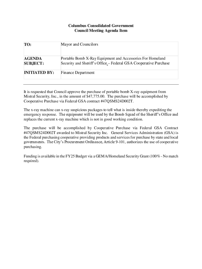 Columbus Consolidated Government Council Meeting Agenda Item TO:Mayor and CouncilorsAGENDA SUBJECT:Portable Bomb XRay Equipment and Accessories For Homeland Security and Sheriffs OfficeFederal GSA
