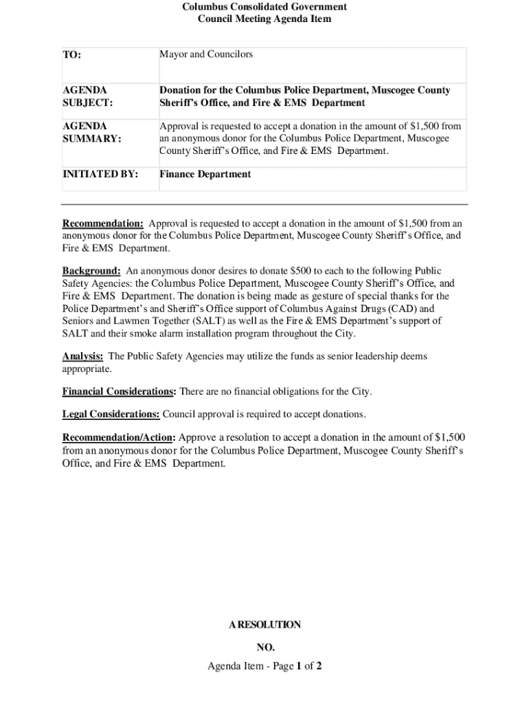 Columbus Consolidated Government Council Meeting Agenda Item TO:Mayor and CouncilorsAGENDA SUBJECT:Donation for the Columbus Police Department, Muscogee County Sheriffs Office, and Fire & EMS DepartmentAGENDA