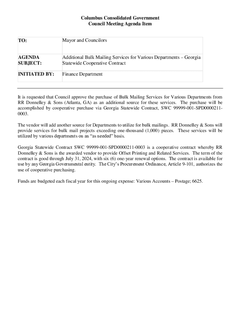 Get the free Mayor and Councilors AGENDA SUBJECT: Additional Bulk ...