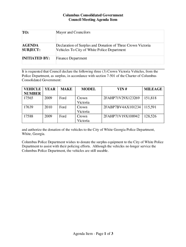 Columbus Consolidated Government Council Meeting Agenda Item TO:Mayor and CouncilorsAGENDA SUBJECT:Declaration of Surplus and Donation of Three Crown Victoria Vehicles To City of White Police DepartmentINITIATED
