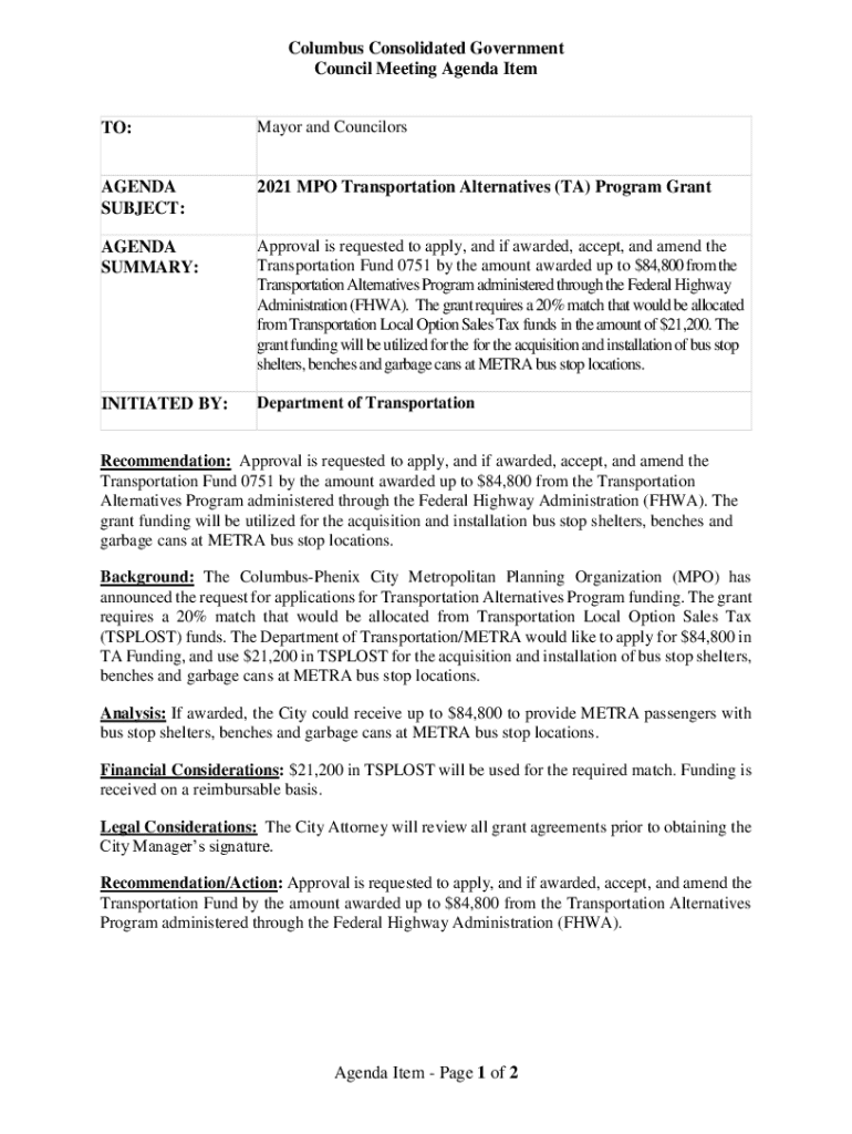 Columbus Consolidated Government Council Meeting Agenda Item TO:Mayor and CouncilorsAGENDA SUBJECT:2021 MPO Transportation Alternatives (TA) Program GrantAGENDA SUMMARY:Approval is requested to apply,