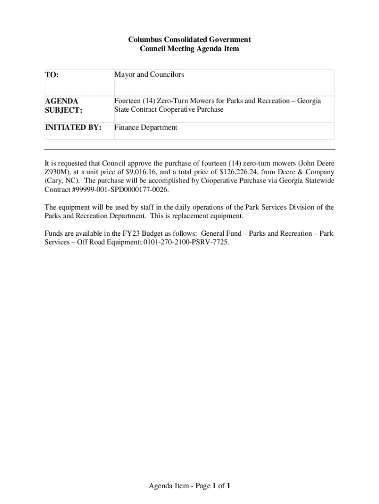 Get the free Mayor and Councilors AGENDA SUBJECT: Six (6) Zero Turn ...