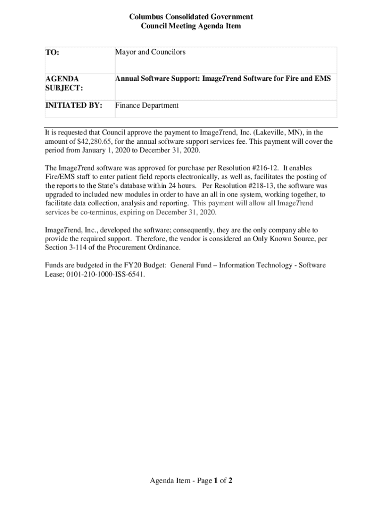 Columbus Consolidated Government Council Meeting Agenda Item TO:Mayor and CouncilorsAGENDA SUBJECT:Annual Software Support: ImageTrend Software for Fire and EMSINITIATED BY:Finance DepartmentIt is