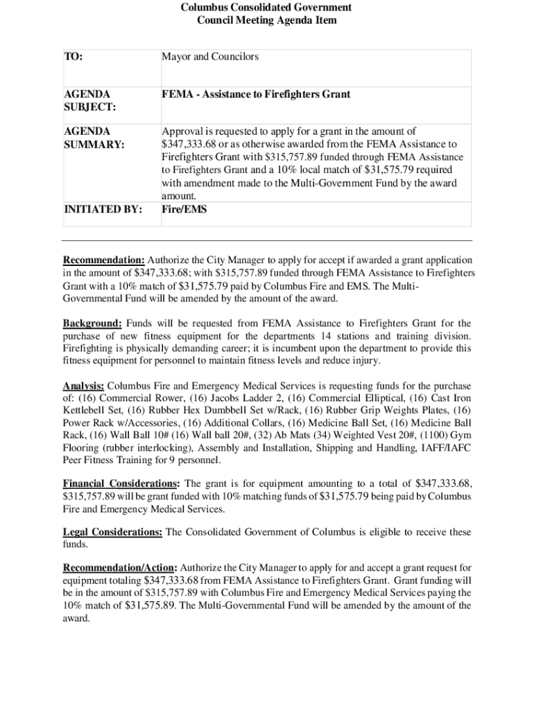 Columbus Consolidated Government Council Meeting Agenda Item TO:Mayor and CouncilorsAGENDA SUBJECT:FEMAAssistance to Firefighters GrantAGENDA SUMMARY:Approval is requested to apply for a grant in