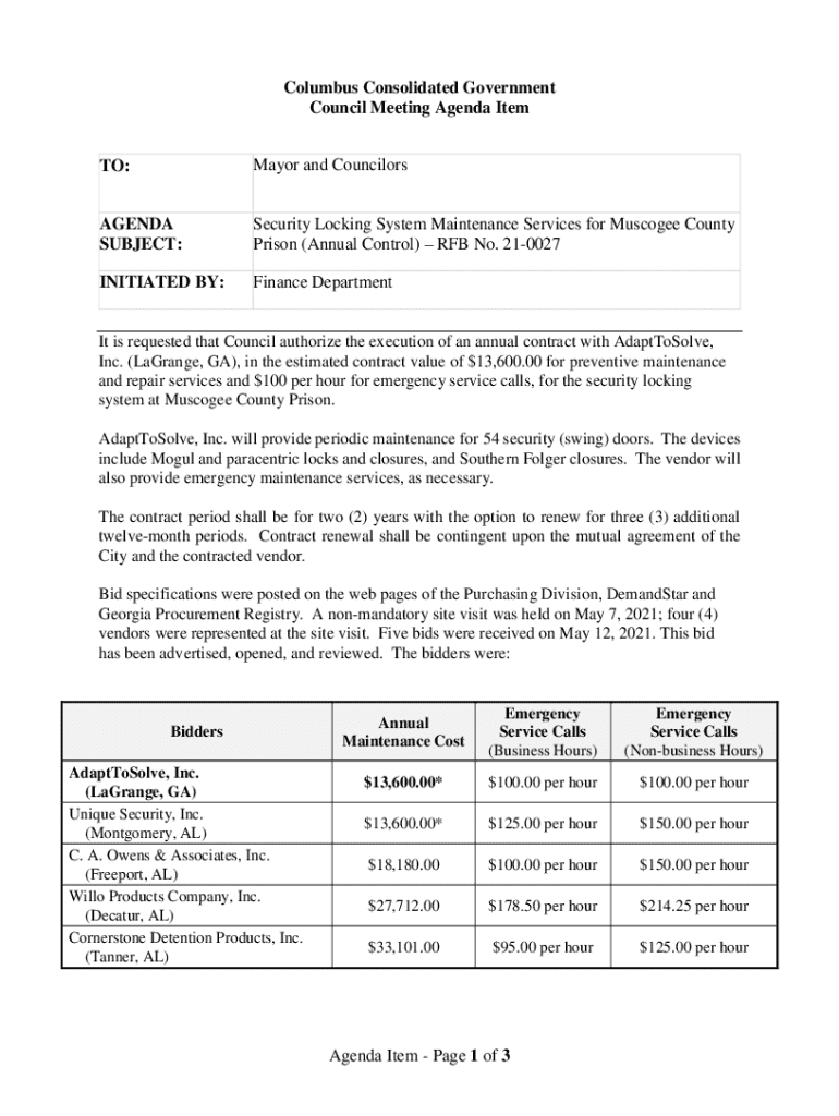 Get the free Security Locking System Maintenance Services for Muscogee County