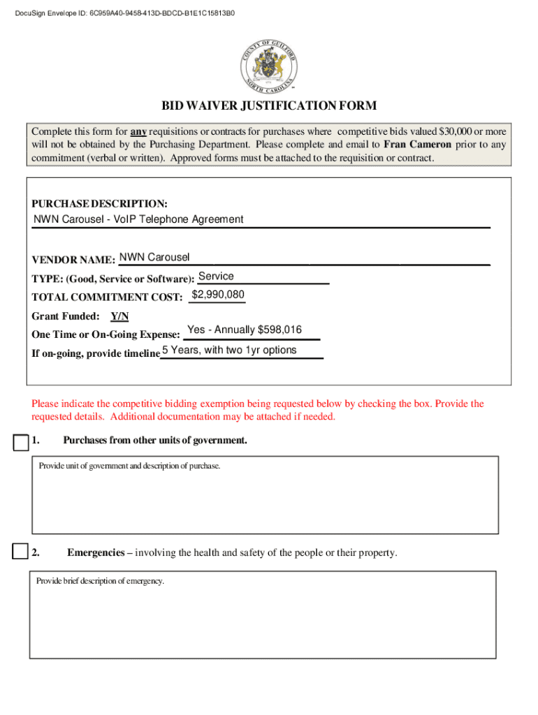 DocuSign Envelope ID: 6C959A409458413DBDCDB1E1C15813B0BID WAIVER JUSTIFICATION FORM Complete this form for any requisitions or contracts for purchases where competitive bids valued $30,000 or more