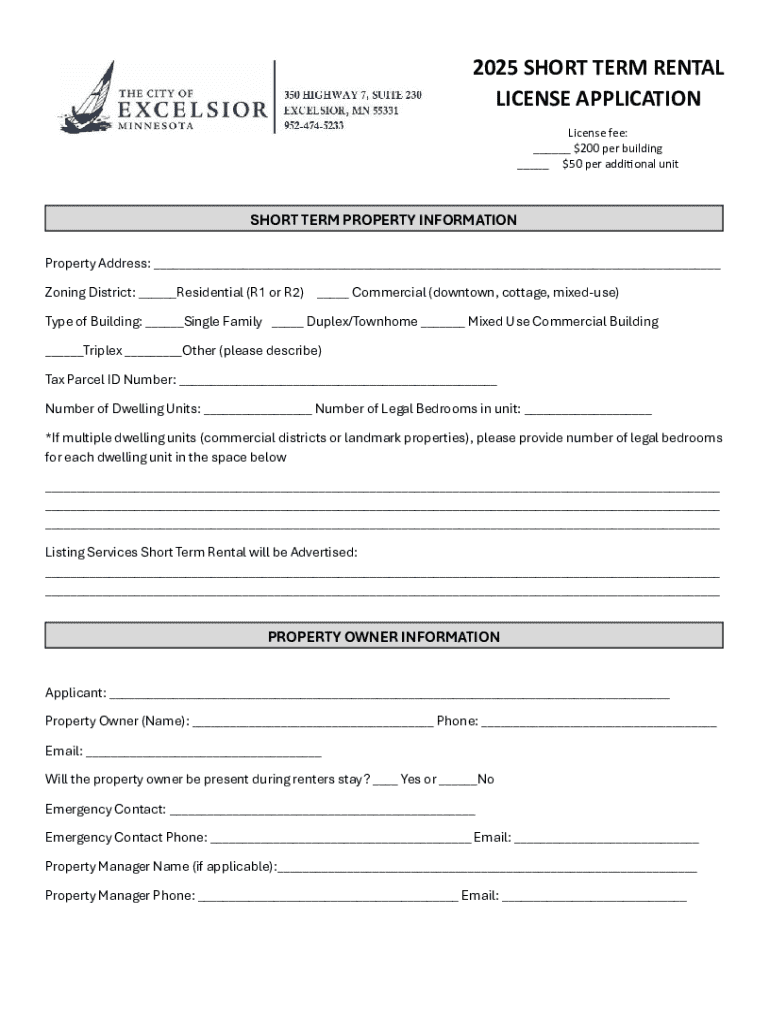 The City of Excelsior short-term form serves as an essential document for property owners wishing to engage in short-term rentals within city limits. This form is crucial as it streamlines the process of compliance with city regulations, ensuring that both property owners and their guests remain informed and protected under local laws. For residents and temporary visitors alike, understanding the nuances of this form can greatly enhance their experience in the city, aligning their needs with Excelsior’s evolving tourism landscape.