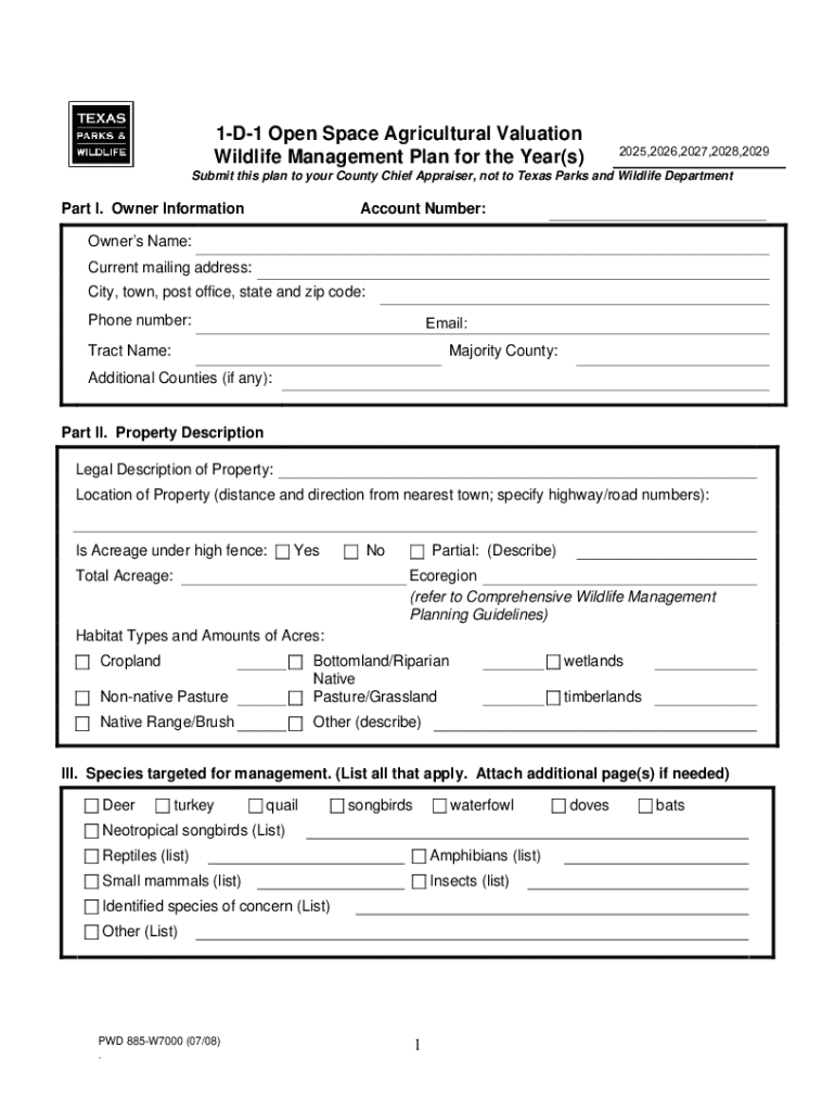 1D1 Open Space Agricultural Valuation Wildlife Management Plan for the Year(s)2025,2026,2027,2028,2029Submit this plan to your County Chief Appraiser, not to Texas Parks and Wildlife DepartmentPart