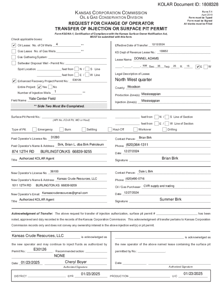 KOLAR Document ID: 1808328K ANSAS CORPORATION COMMISSIONForm T1 April 2019 Form must be Typed Form must be Signed All blanks must be FilledOIL & GAS CONSERVATION DIVISION REQUEST FOR CHANGE OF OPERATOR