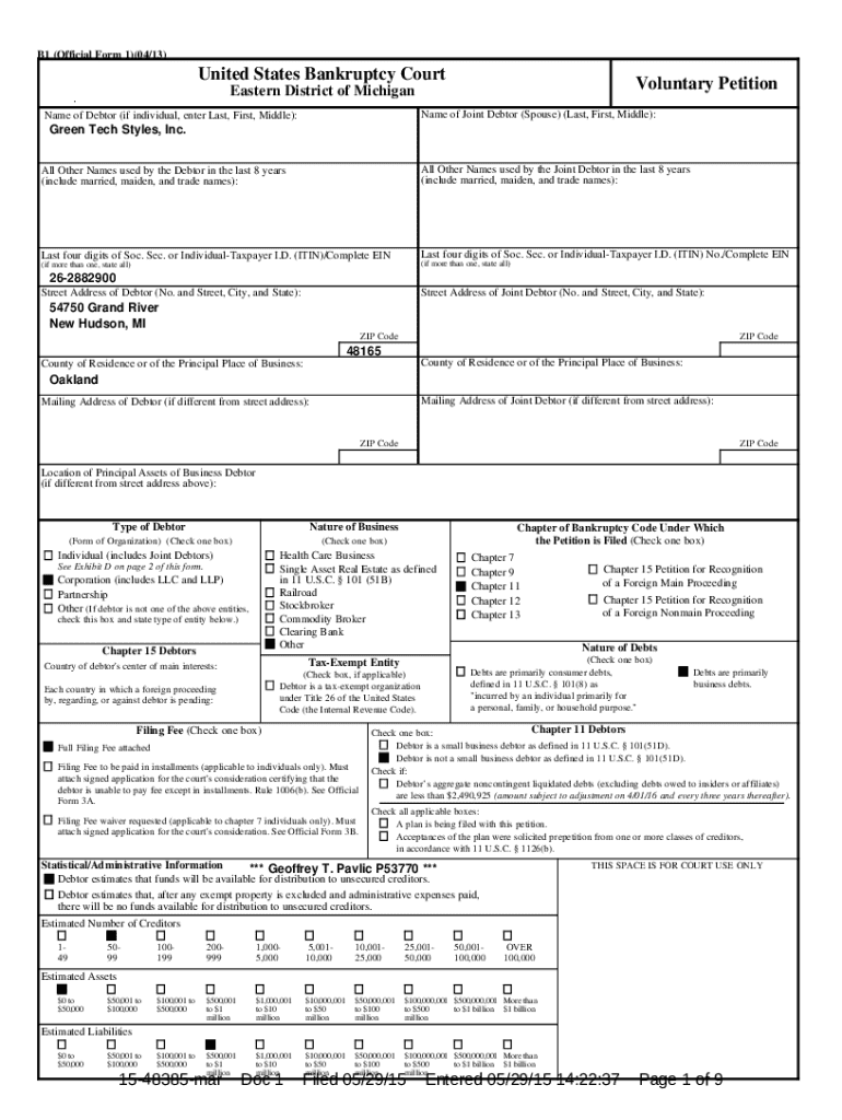 Get the free Bankruptcy Forms. Green Tech Styles, Inc. - Geoffrey T. Pavlic P53770