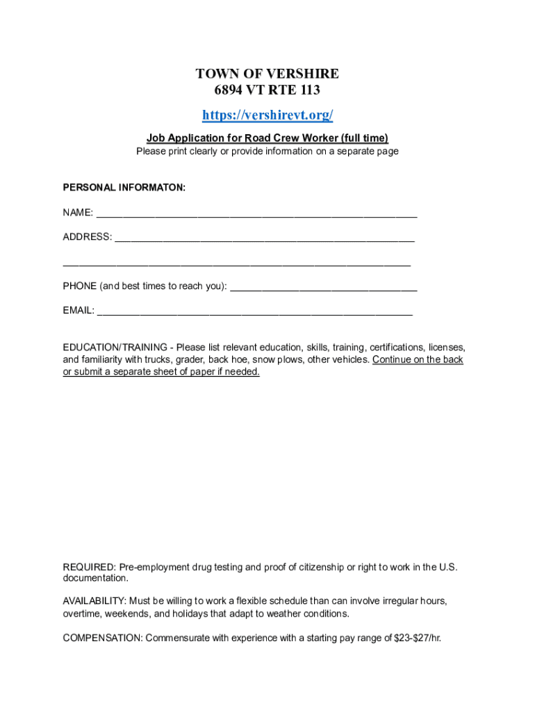 Get the free TOWN OF VERSHIRE, VT ROAD CREW WORKER