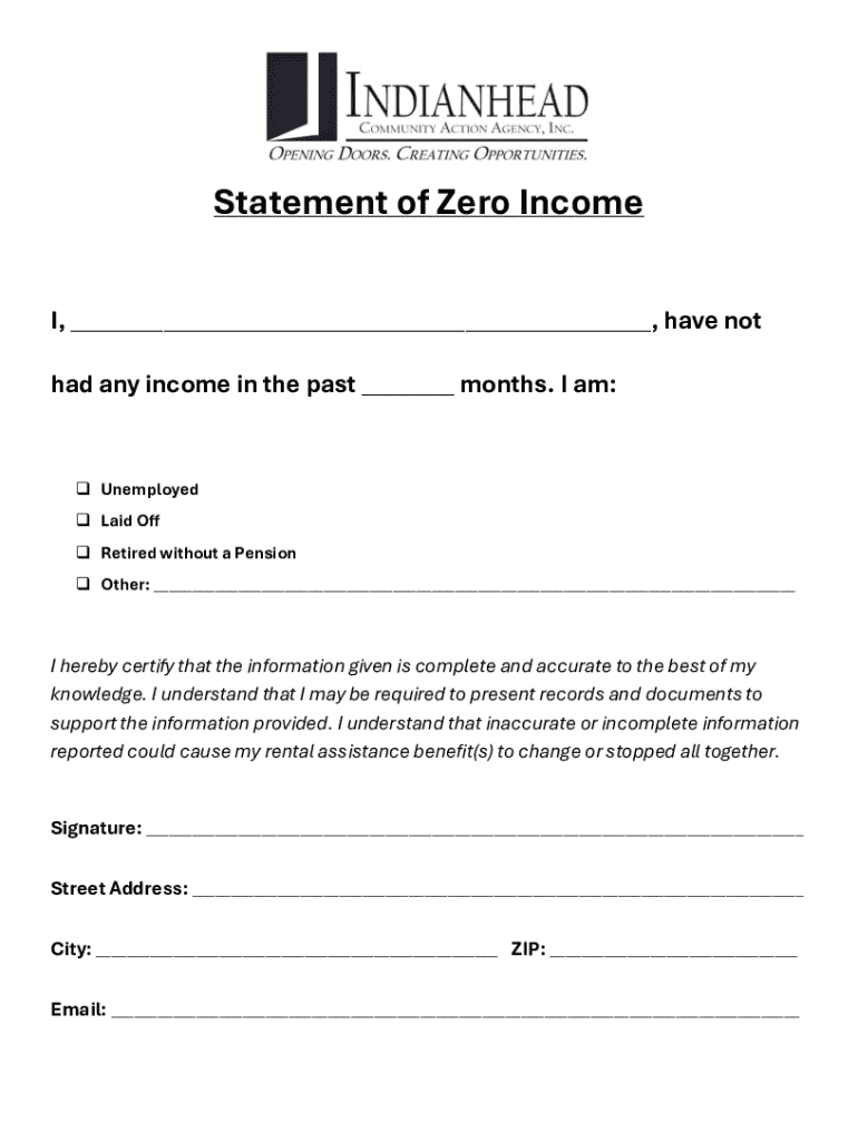 Statement of Zero Income I, ___, have not had any income in the past ___ months. I am: UnemployedLaid OffRetired without a PensionOther: ___I hereby certify that the information given is complete