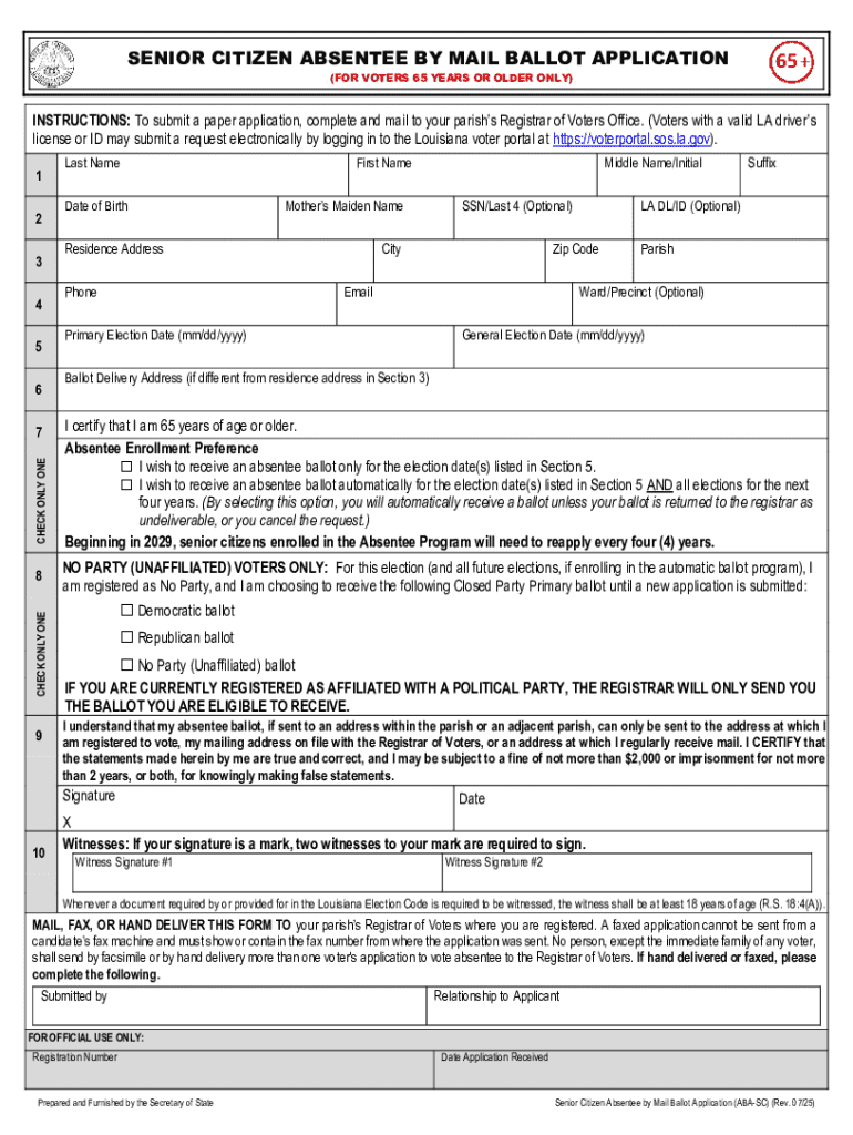 SENIOR CITIZEN ABSENTEE BY MAIL BALLOT APPLICATION (FOR VOTERS 65 YEARS OR OLDER ONLY)INSTRUCTIONS: To submit a paper application, complete and mail to your parishs Registrar of Voters Office. (Voters