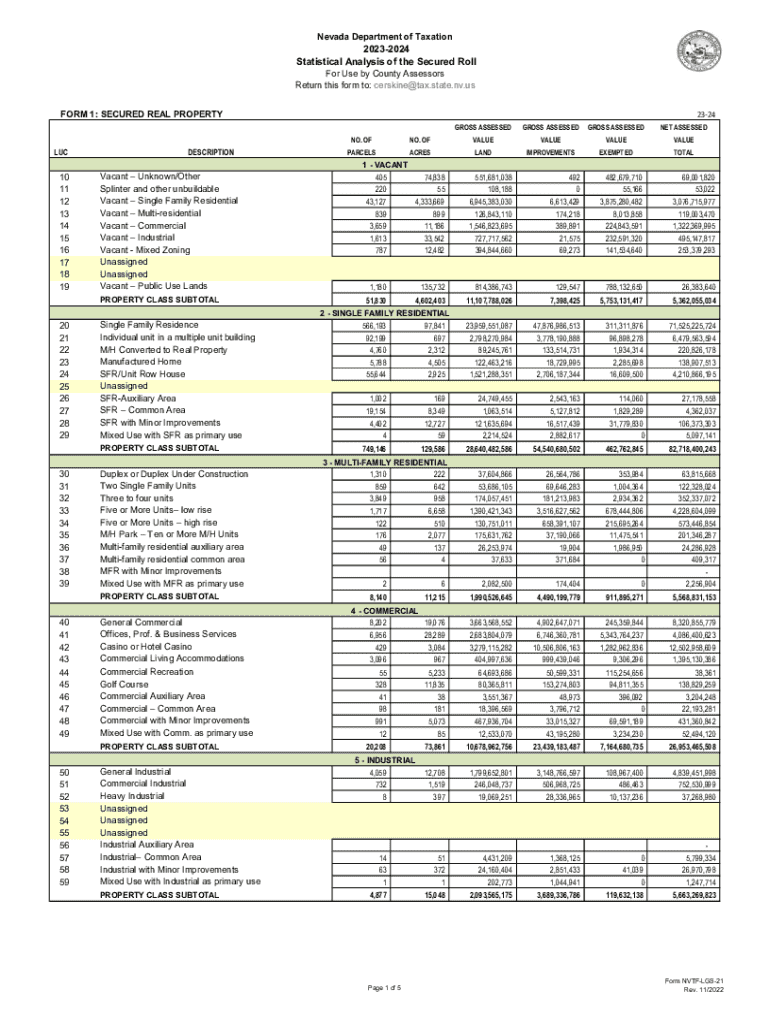 Nevada Department of Taxation20232024 Statistical Analysis of the Secured RollFor Use by County Assessors Return this form to: cerskine@tax.state.nv.us FORM 1: SECURED REAL PROPERTY2324 GROSS ASSESSEDLUC10