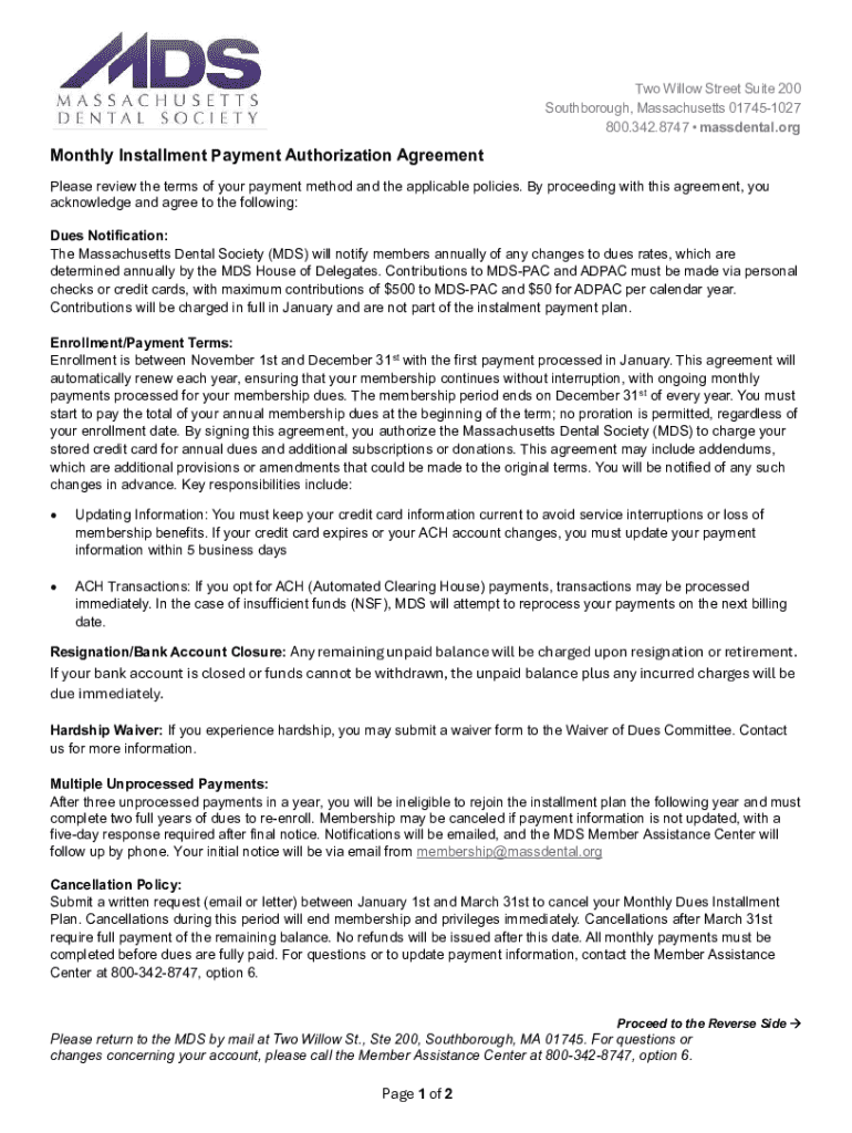 Get the free Monthly Installment Payment Authorization and Agreement Form 10.2.2025