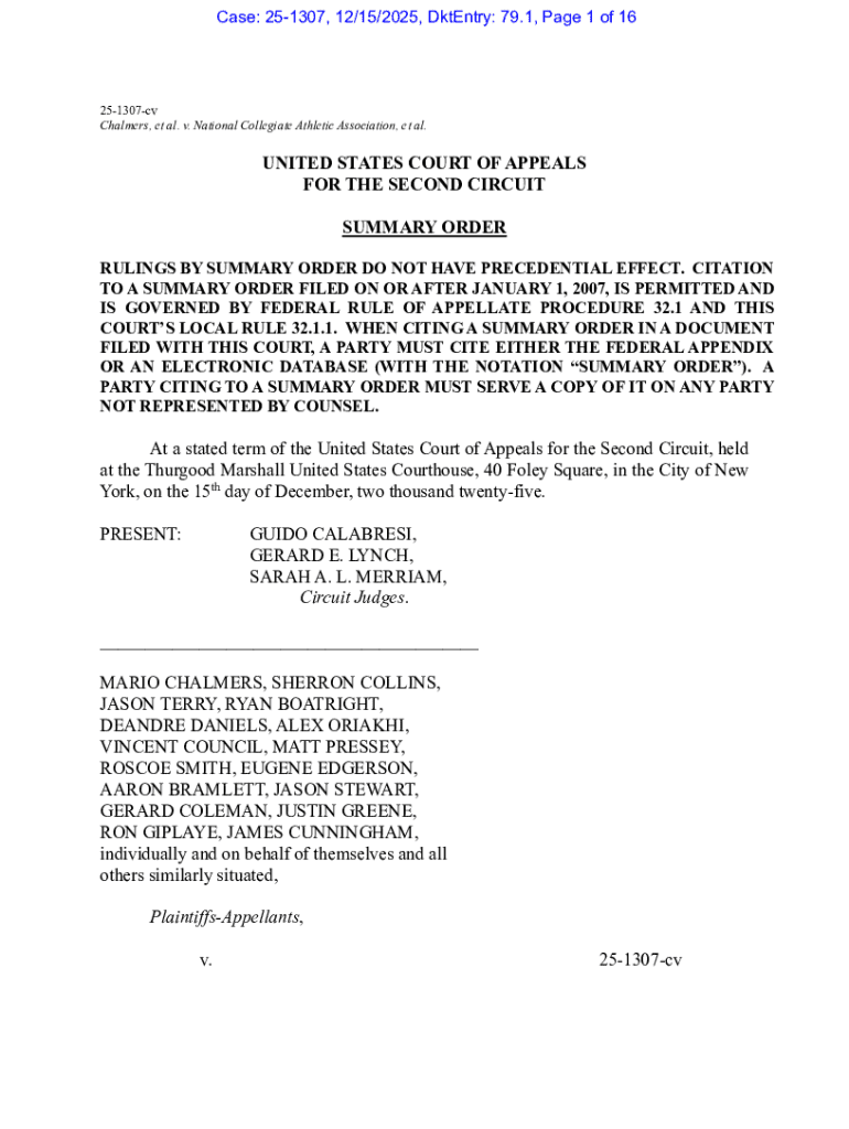 Case: 251307, 12/15/2025, DktEntry: 79.1, Page 1 of 16251307cv Chalmers, et al. v. National Collegiate Athletic Association, et al.UNITED STATES COURT OF APPEALS FOR THE SECOND CIRCUIT SUMMARY ORDER