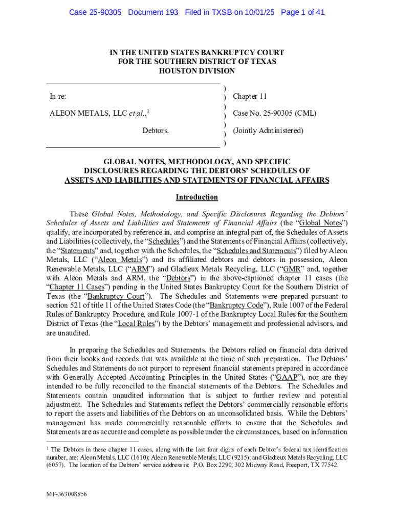 Case 2590305 Document 193 Filed in TXSB on 10/01/25 Page 1 of 41IN THE UNITED STATES BANKRUPTCY COURT FOR THE SOUTHERN DISTRICT OF TEXAS HOUSTON DIVISION ) ) Chapter 11 ) ) Case No. 2590305 (CML)