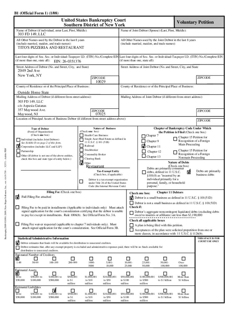 B1 (Official Form 1) (1/08)United States Bankruptcy Court Southern District of New York Name of Debtor (if individual, enter Last, First, Middle):Voluntary PetitionName of Joint Debtor (Spouse) (Last,