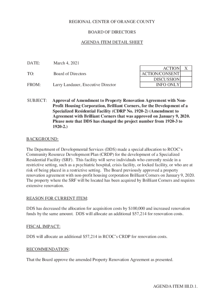 REGIONAL CENTER OF ORANGE COUNTY BOARD OF DIRECTORS AGENDA ITEM DETAIL SHEETDATE:March 4, 2021 ACTION ACTION/CONSENT DISCUSSION INFO ONLYXTO:Board of DirectorsFROM:Larry Landauer, Executive DirectorSUBJECT:Approval