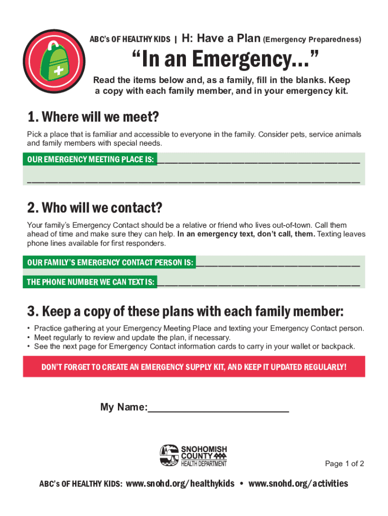 ABCs OF HEALTHY KIDS | H: Have a Plan (Emergency Preparedness)In an Emergency...Read the items below and, as a family, fill in the blanks. Keep a copy with each family member, and in your emergency