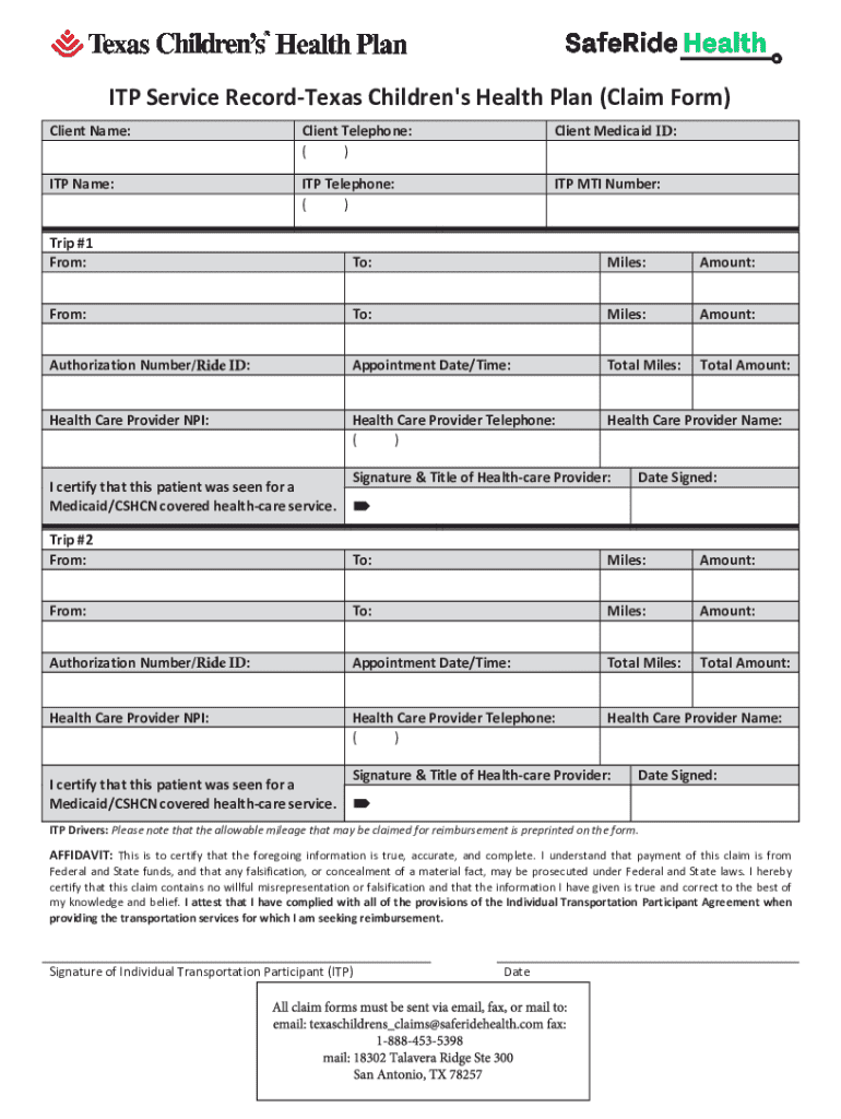 ITP Service RecordTexas Children\'s Health Plan (Claim Form) Client Name:Client Telephone: ( )Client MedicaidITP Name:ITP Telephone: ( )ITP MTI Number::Trip #1 From:To:Miles:Amount:From:To:Miles:Amount:Appointment