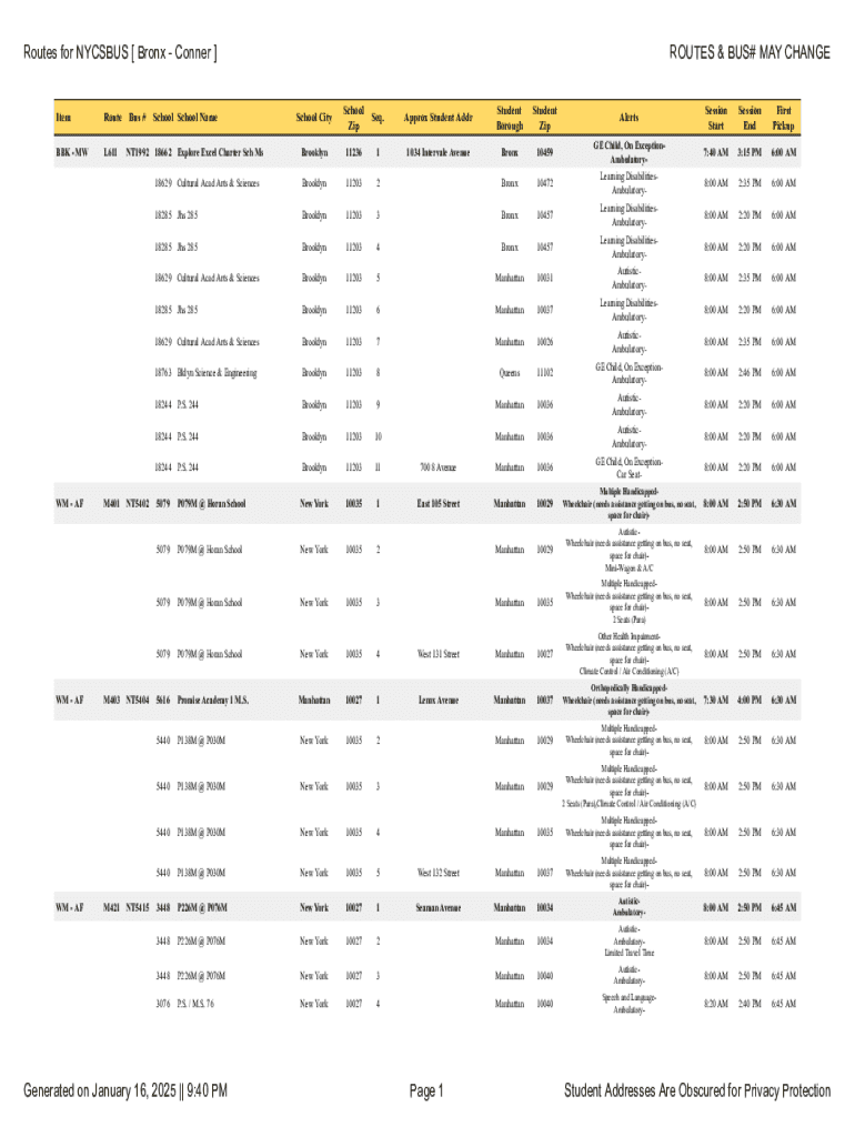 Routes for NYCSBUS [ BronxConner ]ItemRoute Bus # School School NameBBKMWL611Approx Student AddrStudent BoroughStudent ZipAlertsSession StartSession EndFirst Pickup1034 Intervale AvenueBronx10459GE