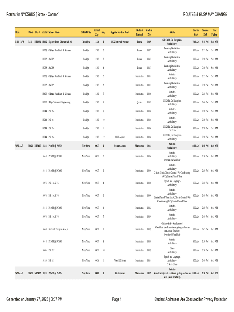 Routes for NYCSBUS [ BronxConner ]ItemRoute Bus # School School NameBBKMWL611School Seq. ZipApprox Student AddrStudent BoroughStudent ZipAlertsSession StartSession EndFirst Pickup1032 Intervale AvenueBronx10459GE