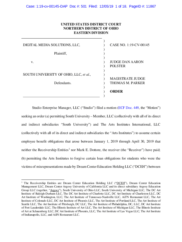 Case: 1:19cv00145DAP Doc #: 501 Filed: 12/05/19 1 of 18. PageID #: 11867UNITED STATES DISTRICT COURT NORTHERN DISTRICT OF OHIO EASTERN DIVISION DIGITAL MEDIA SOLUTIONS, LLC, Plaintiff, v.SOUTH UNIVERSITY