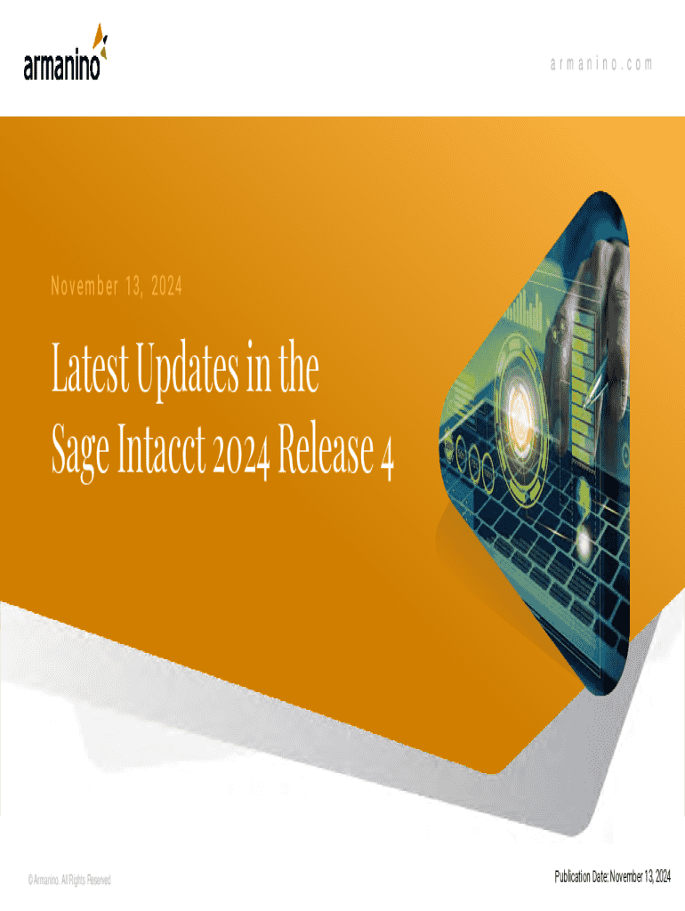 a r m a n i n o .a cr om ma n i n o . c o mN o v e m b e r 13, 2024Latest Updates in the Sage Intacct 2024 Release 4 Armanino. All Rights ReservedPublication Date: November 13, 2024a r m a n i n o
