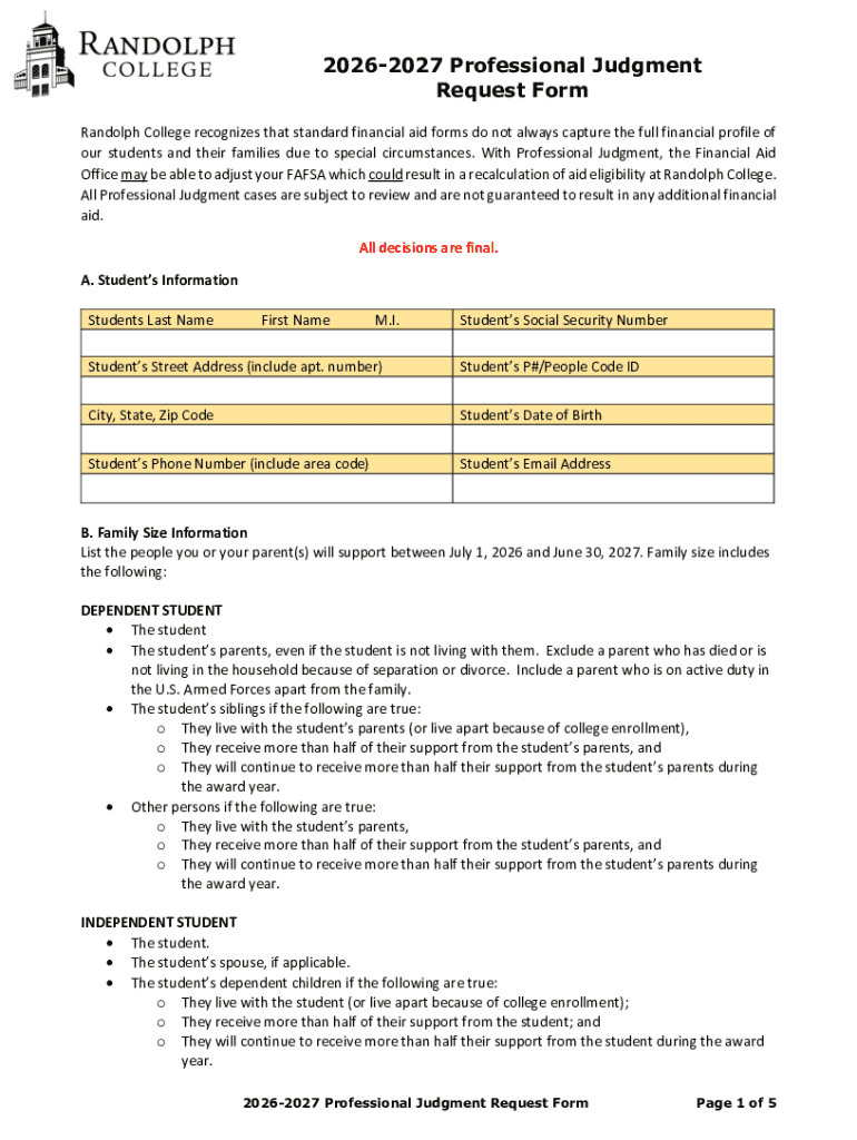 Get the free 2026-2027 Professional Judgment Request Form Randolph College