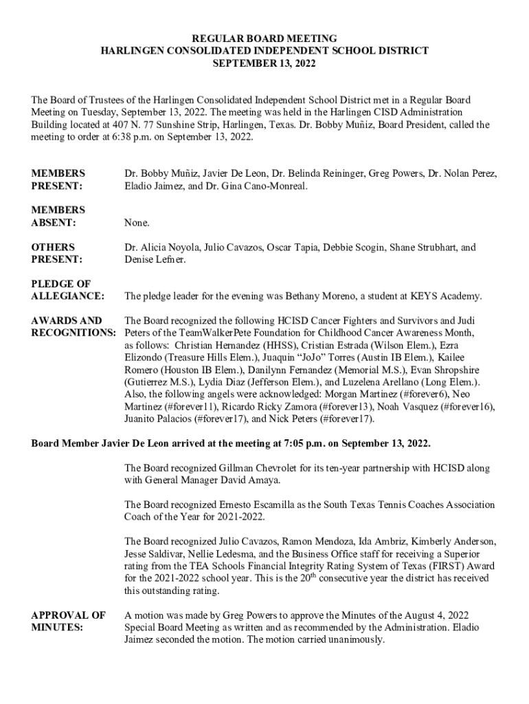 REGULAR BOARD MEETING HARLINGEN CONSOLIDATED INDEPENDENT SCHOOL DISTRICT SEPTEMBER 13, 2022 The Board of Trustees of the Harlingen Consolidated Independent School District met in a Regular Board Meeting