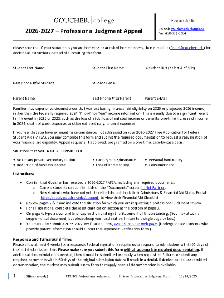 How to submit:20262027Professional Judgment AppealUpload: goucher.edu/faupload Fax: 4103376504Please note that if your situation is you are homeless or at risk of homelessness, then email us (finaid@goucher.edu)
