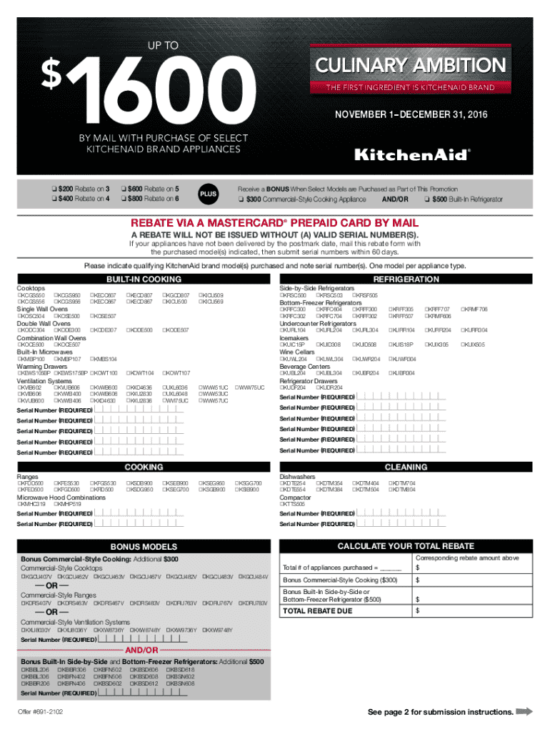 1600 UP TO$THE FIRST INGREDIENT IS KITCHENAID BRANDNOVEMBER 1DECEMBER 31, 2016BY MAIL WITH PURCHASE OF SELECT KITCHENAID BRAND APPLIANCES $200 Rebate on 3$400 Rebate on 4 $600 Rebate on 5$800 Rebate