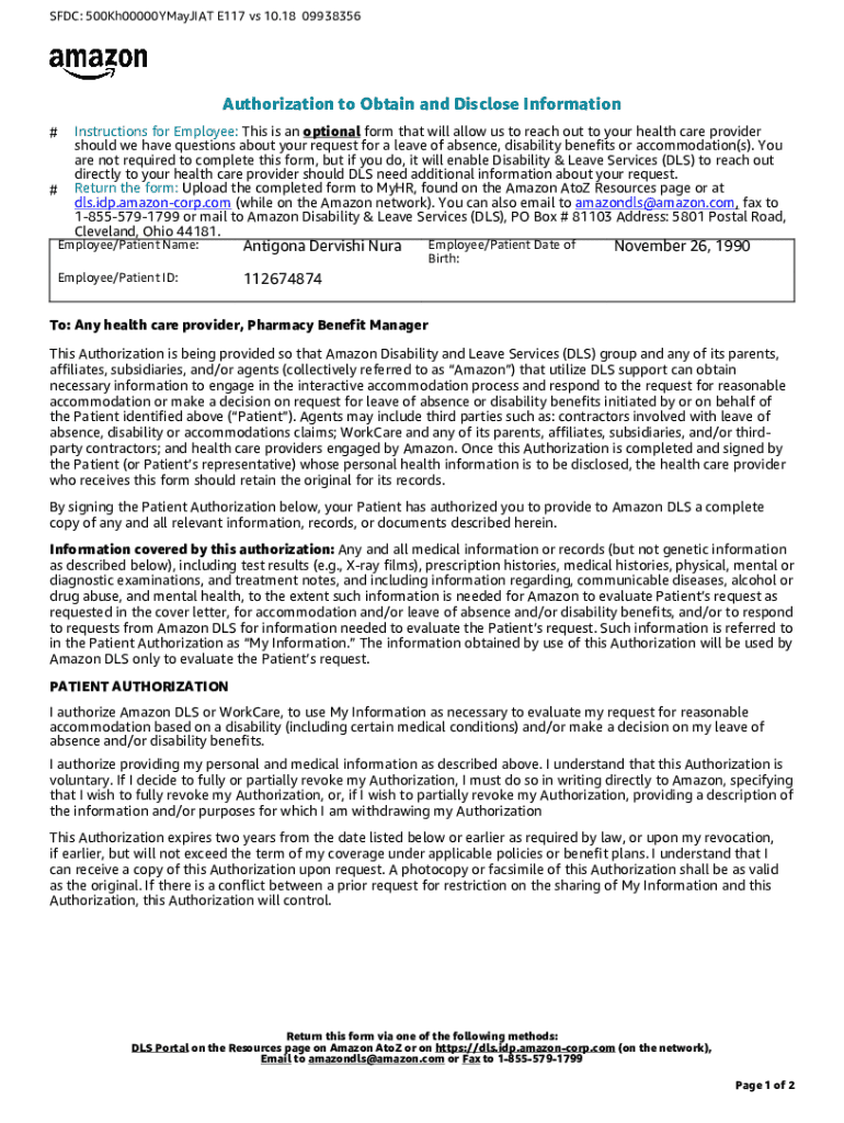 SFDC: 500Kh00000YMayJIAT E117 vs 10.18 09938356Authorization to Obtain and Disclose Information Instructions for Employee: This is an optional form that will allow us to reach out to your health care
