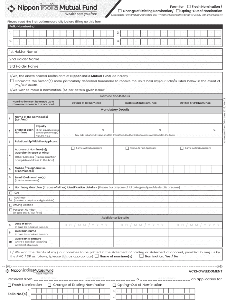 Form for Fresh Nomination / Change of Existing Nomination/ OptingOut of Nomination (Applicable for Individual Unitholders onlywhether holding Units Singly or Jointly with other holders)Please read