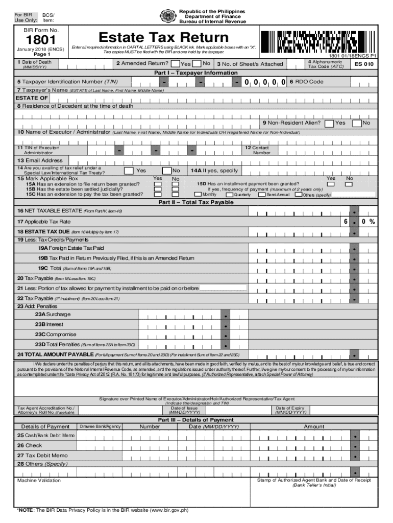Get the free BIR Form 1801 Estate Tax Return .pdf - For BIR Use Only