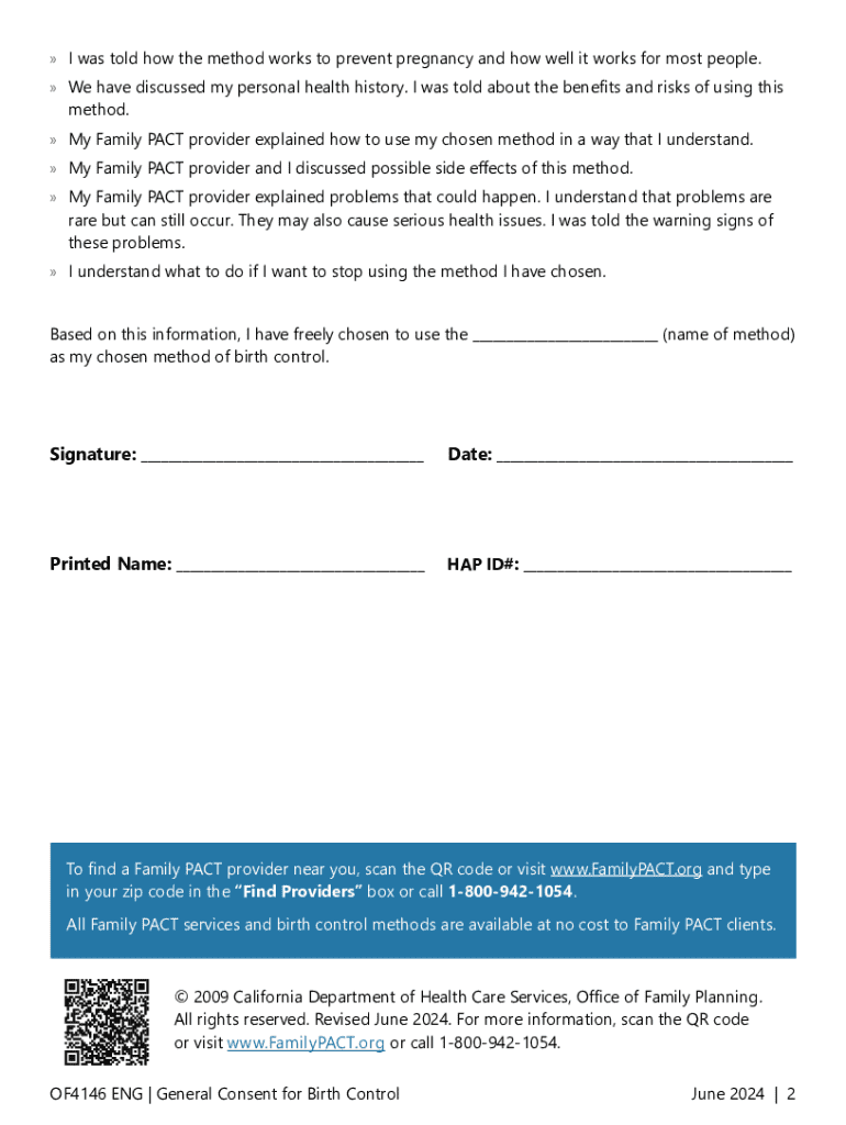 GENERAL CONSENT FOR BIRTH CONTROLWhen you sign this consent form, it means that: Your Family PACT provider informed you of the many different types of birth control. You discussed the things that