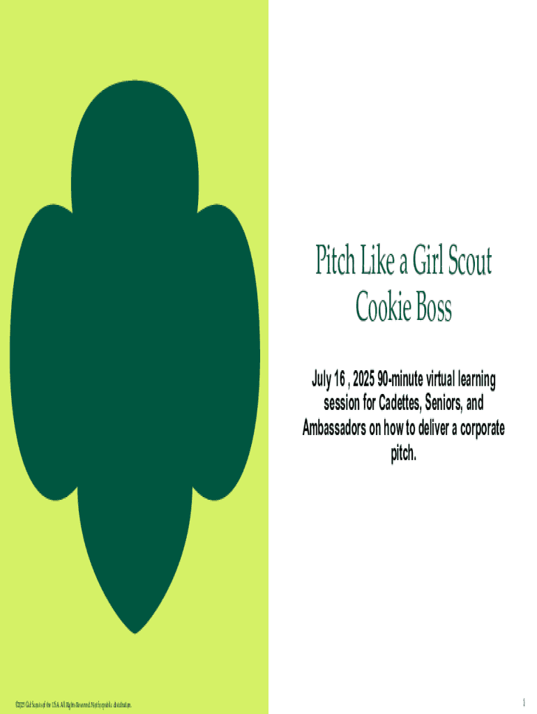 Pitch Like a Girl Scout Cookie Boss July 16 , 2025 90minute virtual learning session for Cadettes, Seniors, and Ambassadors on how to deliver a corporate pitch.2025 Girl Scouts of the USA. All Rights