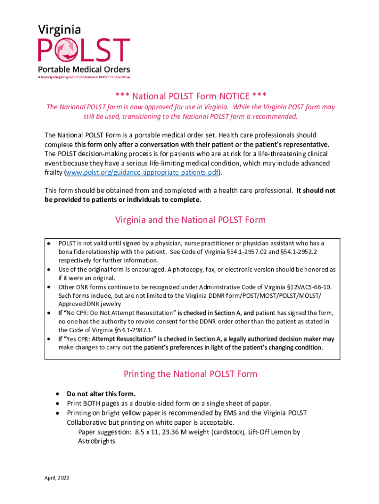 Get the free national polst fillable form w- virginia info (version 2020.05.11) 022723 (1).pdf