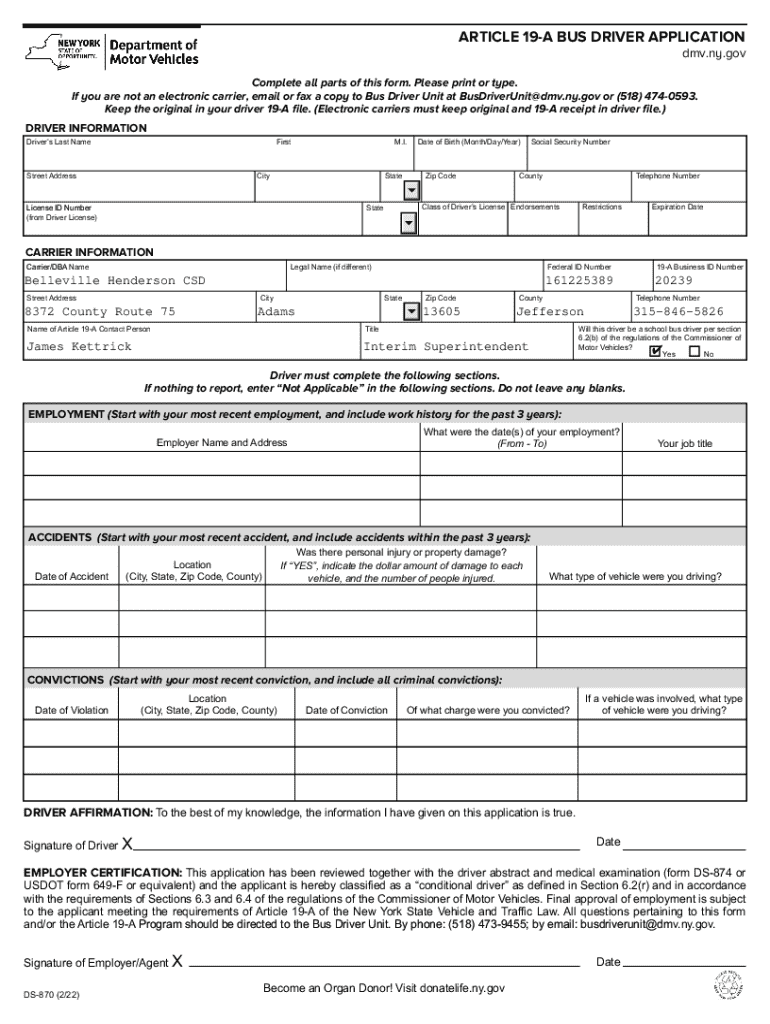 ARTICLE 19A BUS DRIVER APPLICATION dmv.ny.gov Complete all parts of this form. Please print or type. If you are not an electronic carrier, email or fax a copy to Bus Driver Unit at BusDriverUnit@dmv.ny.gov