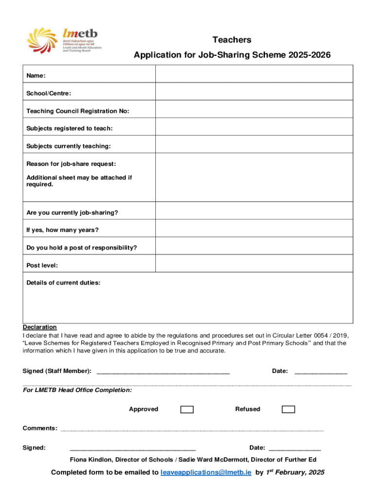 Teachers Application for JobSharing Scheme 20252026 Name: School/Centre: Teaching Council Registration No: Subjects registered to teach: Subjects currently teaching: Reason for jobshare request: Additional