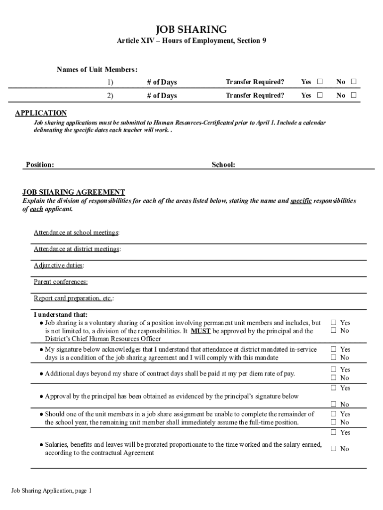 JOB SHARING Article XIVHours of Employment, Section 9Names of Unit Members: 1)# of DaysTransfer Required?Yes No 2)# of DaysTransfer Required?Yes No APPLICATION Job sharing applications must be submitted